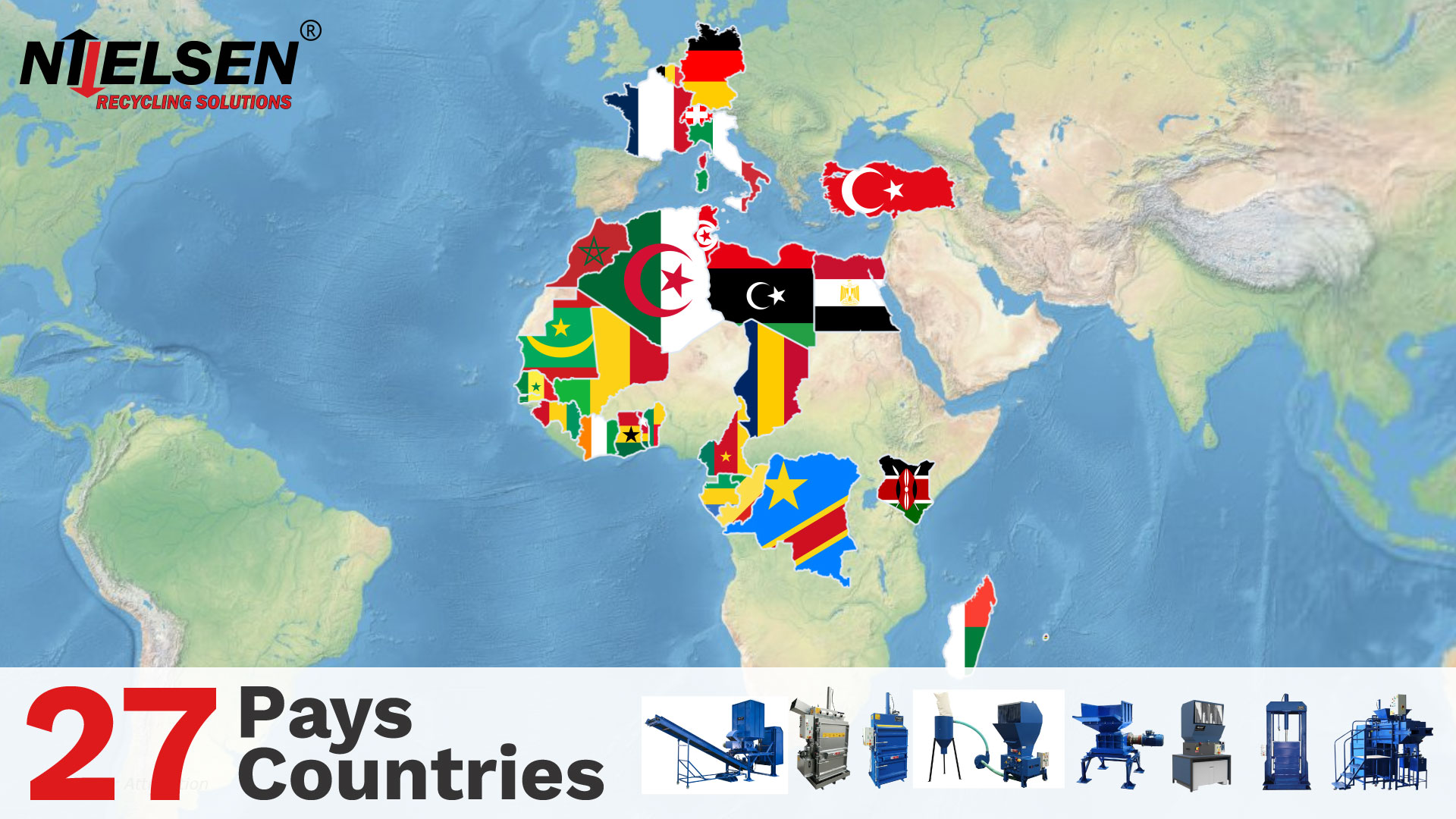 NIELSEN conçoit, fabrique et commercialise des presses à balles verticales, des systèmes de tri et de convoyage, des compacteurs de déchets, des broyeurs industriels, des perforateurs de bouteilles, des destructeurs de déchets alimentaires, des presses ensacheuses de déchets verts, des bennes et caissons et divers équipements de collecte permettant le traitement et la valorisation des déchets.